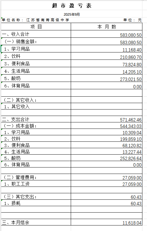 2025年9月超市盈亏表